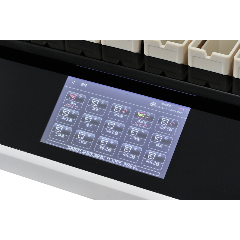 ◇ 該機(jī)為小體積型機(jī)器,放置空間大,界面采用7吋電容式觸摸屏操作系統(tǒng),觸摸靈敏、顯示清晰,人機(jī)對話便捷。具有中、英文在線切換顯示功能,可適合多語言用戶。為病理分析提供快速冰凍染色和HE常規(guī)染色的一致性。