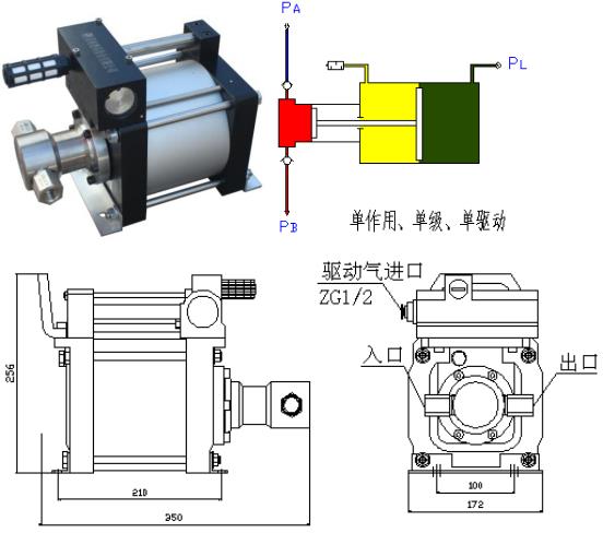 德科泵采用大氣體活塞與小直徑液壓柱塞連接在一起的結構。利用兩個活塞的面積比產生壓力比,通過壓力比可以計算出最大輸出壓力。高壓力比產生很高的出口壓力。 型號中的數(shù)字為該型號產品的額定壓力比。而技術參數(shù)則表明液泵的實際壓力比。 通過一個簡單的氣體減壓閥可以設定出口壓力。 壓力比*氣體驅動壓力=輸出壓力
