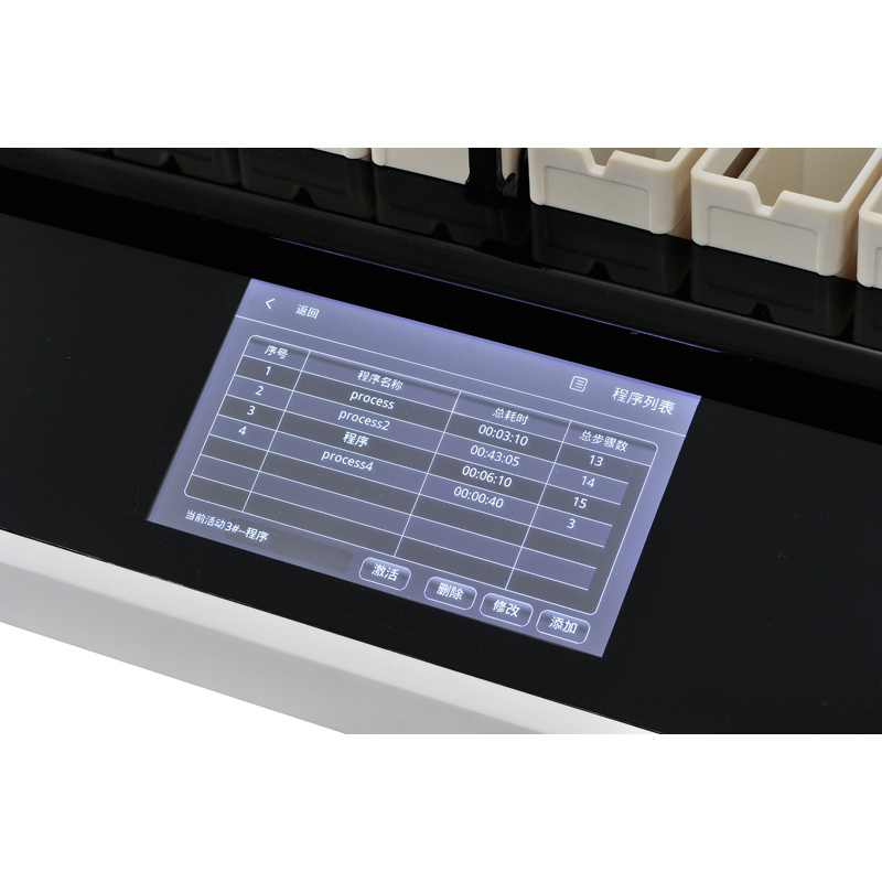 ◇ 染色次序、液體名稱、缸號、時間、可由用戶自行編程編譯錄入并自動記憶,浸入時間較長的試劑缸可設(shè)置多個重復(fù)缸,加快染片運(yùn)行速度,并有優(yōu)先級別選項功能,多染架同時運(yùn)行時,自動優(yōu)化染色進(jìn)程,智能識別。
